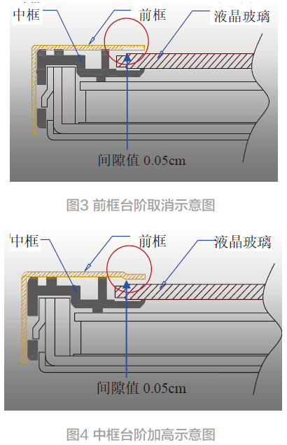 对策②中,通过加高中框的支撑面而使得玻璃与前框的间隙加大,这样,在整机装配中,面壳台阶与液晶玻璃的间隙加大,避免了面壳台阶直接压迫液晶玻璃,在实际的试验中,对策②解决了漏光现象。