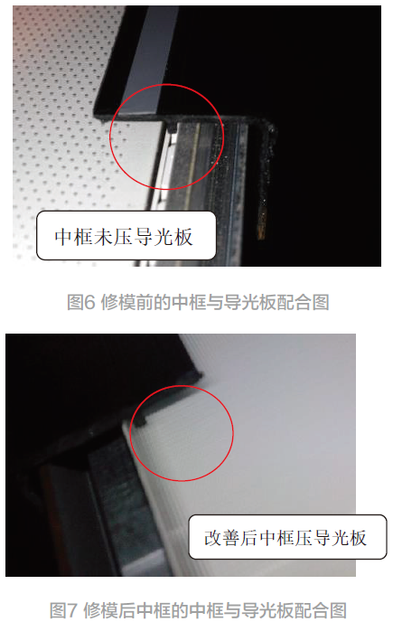 经上分析,我们确定了导光板的受热形变量过大是因为中框没要压住导光板所致。所以,必须对中框进行修模,使加强筋能很好地压住导光板,确保导光板受热时的形变量可控。为了更好的抑制导光板的热变形,中框的修模主要从两方面进行:一方面导光板的加强筋向AA 区方向移动0.15 cm,使中框的加强筋压合导光板的距离由原来的0.05 cm 增大为0.20 cm,确保中框加强筋可以压到导光板,另一方面加强筋向下长0.02 cm,减少加强筋与导光板间隙,更好的抑制热变形。修模后中框与导光板的配合情况如图7 所示。改善后的中框经实验确认有效,很好地解决了导光板的热变形问题。